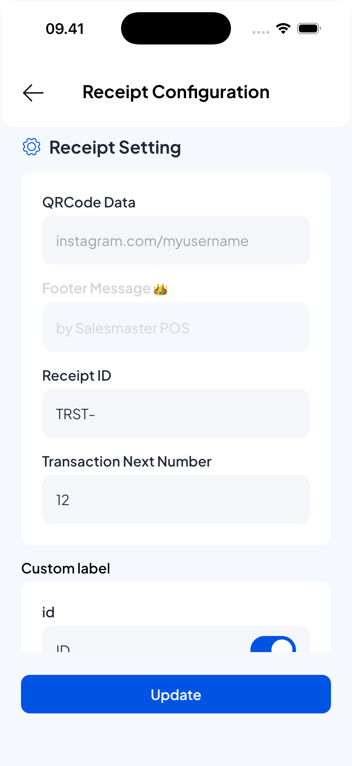 • Receipt next number — the sequence or suffix after the receipt ID (example: if Receipt ID is TRX and next number is 3, next receipts will be TRX-3).